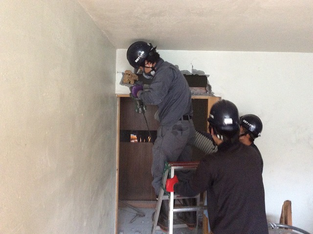 お客様と相談すると間口を壊しても問題無いとの事なので間口上部をハツリ作業にて大きく取らせて頂き搬出致しました。